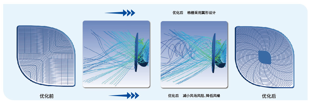 YES-slim+系列,將出風(fēng)格柵進(jìn)一步優(yōu)化,采用CFD仿真技術(shù),主筋條采用翼形設(shè)計(jì),有效減小風(fēng)場(chǎng)出風(fēng)的發(fā)散性和風(fēng)阻,降低風(fēng)噪。