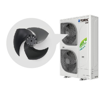 外機(jī)軸流風(fēng)扇采用反振顫型葉片設(shè)計(jì),軸流風(fēng)扇的三葉片通過模擬仿真修正葉片骨線,實(shí)現(xiàn)葉片自身反振顫,有效抵御空氣流對(duì)葉片的反沖形成的振動(dòng)噪音。